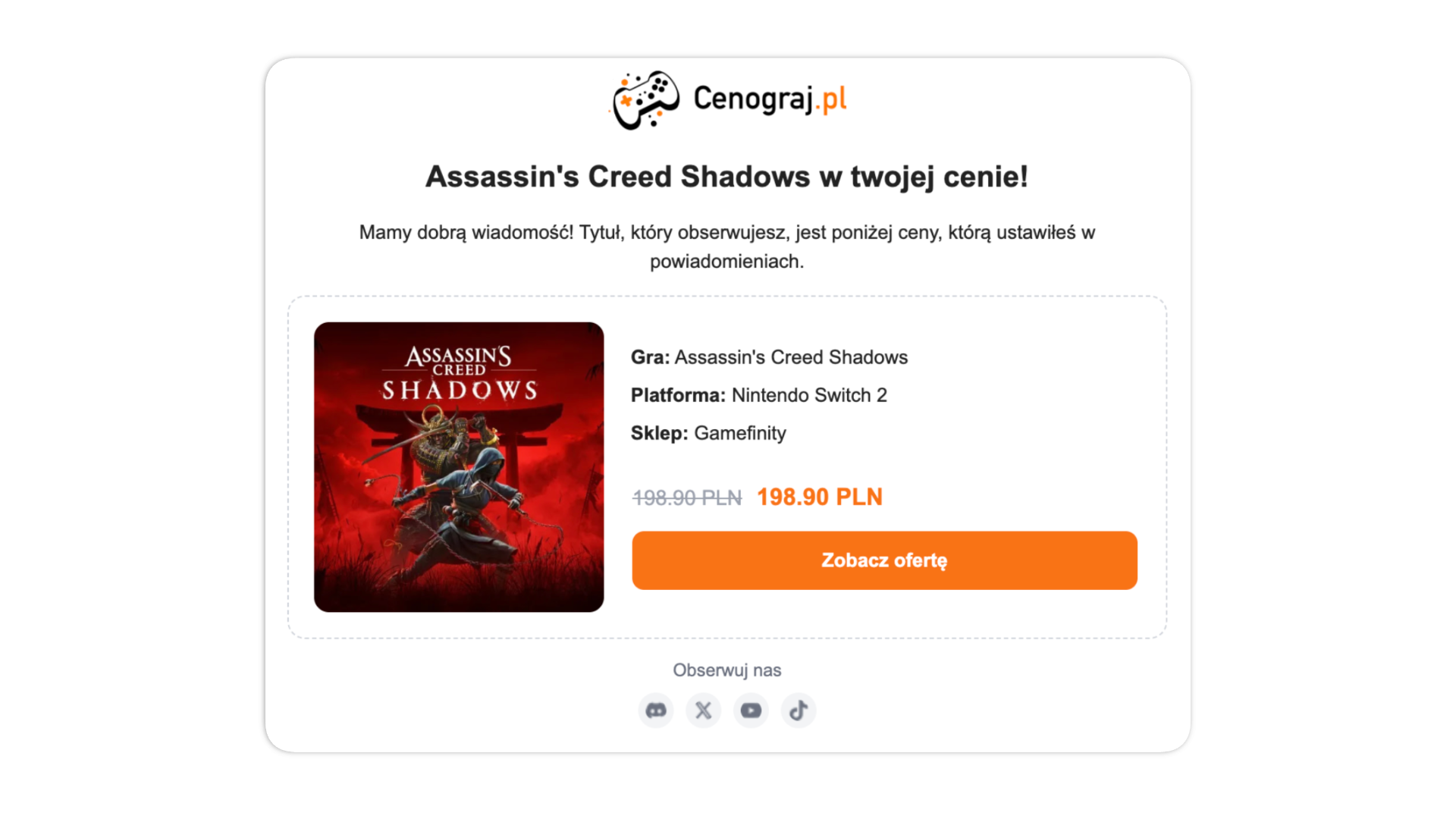 Do tej pory alerty działały u nas głównie jako bot na Discordzie, a lepsze okazje często wyłapywaliście też z naszych postów na X. Teraz dokładamy powiadomienia bezpośrednio na konto użytkownika w dwóch kanałach: web push, czyli krótkie powiadomienie wyskakujące w przeglądarce na komputerze (nawet gdy nie masz otwartej karty z Cenograj.pl), oraz klasyczne powiadomienia wysyłane przez e-mail.