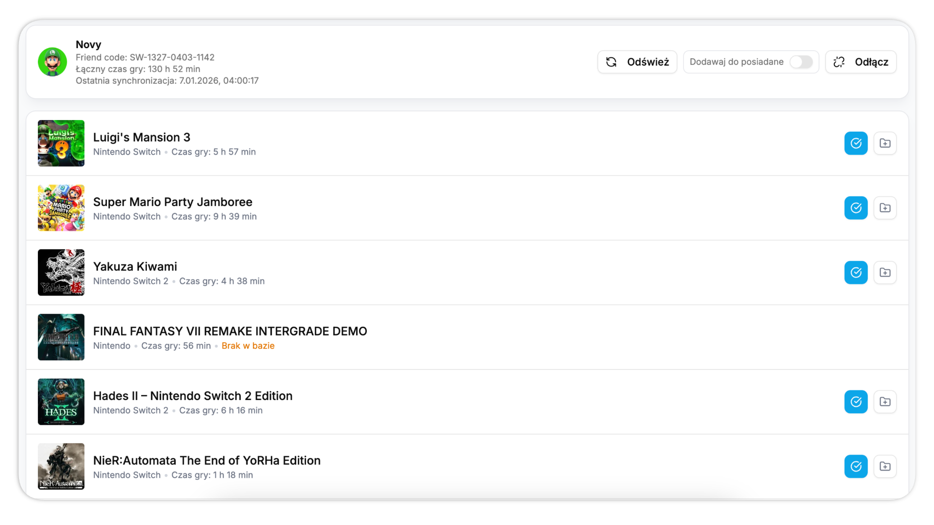 Od teraz kolekcje mogą działać razem z Twoim kontem Nintendo. Po podaniu Friend Code odblokujesz "Grane", czyli listę, która automatycznie zbiera gry widoczne na Twoim profilu. Jeśli chcesz, integracja może też dopisywać je do posiadanych.